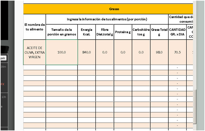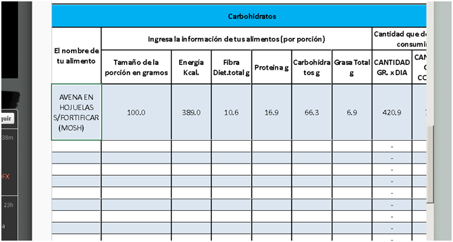 | El nombre de tu alimento | Tamaño de la porción en (onzas o gramos) | EnergíaKcal. | FibraDiet.Totalg | Proteína | Carbo-hidratosg | GrasaTotalg |