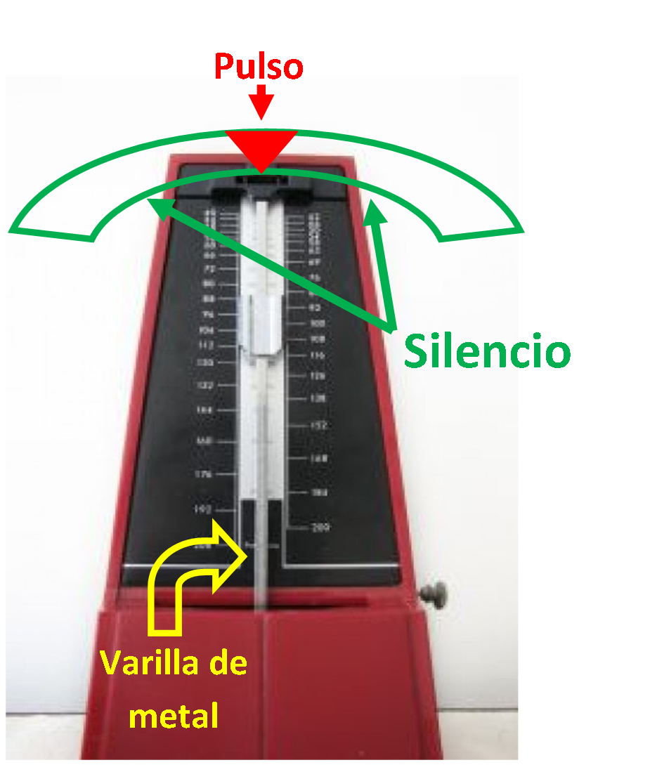 COMPONENTES RITMO - METRONOMOComo podemos ver al centro tienen una varilla de metal (la cual se mueve de lado a lado una vez que el metrónomo es activado), cada vez que la varilla pasa por el centro un «pulso» es emitido y existe un silencio durante su trayecto de ida y vuelta.