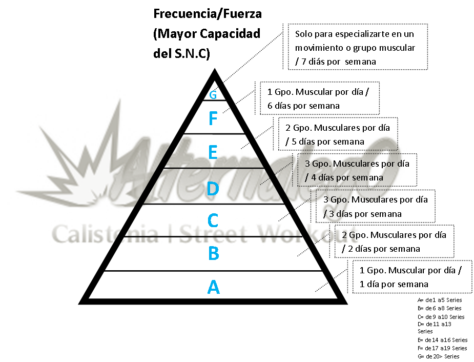 Este elemento para mi es el más importante, es por eso que lo ubico en la parte superior de la grafica.Grafica Relación frecuencia, intensidad y volumen, matriz de planeación y revisión de rutinas, alternalego.com, alternalego, imagen solo con frecuenciaLa frecuencia esta comúnmente relacionada con la cantidad de veces que uno se ejercita por semana, esto en cierta forma es correcto pero, no es precisamente así. Esta mas bien se refiere a la cantidad de días que ejercitas un grupo muscular, o relacionando esto con la calistenia, más bien seria la cantidad de días que practicas cualquiera de los seis ejercicios básicos de la calistenia.