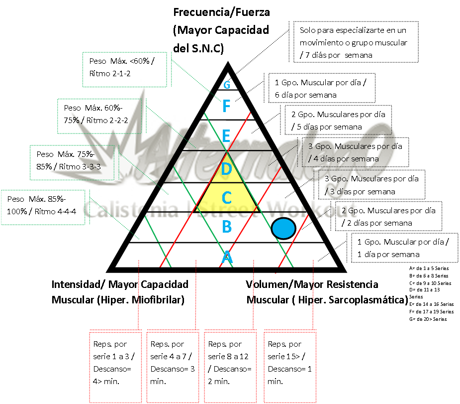 En ella podemos ver que son 4 factores de intensidad y cada uno de ellos está relacionado con una cantidad de peso, los cuales agregaremos a la grafica representados con líneas verdes (las cuales corren de manera diagonal). La forma en que esto se relaciona con la calistenia es que hay un tipo de ritmo para cada una de las cantidades de peso, el cual queda de esta manera (de mayor a menor iniciando en la punta inferior izquierda de la grafica):