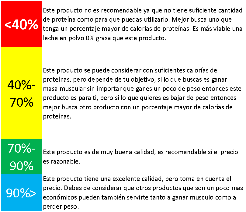 Si utilizamos los datos en la calculadora, nos damos cuenta de que su calidad de la proteína es del 15.94% lo cual es muy baja, trata de evitar este tipo de productos.